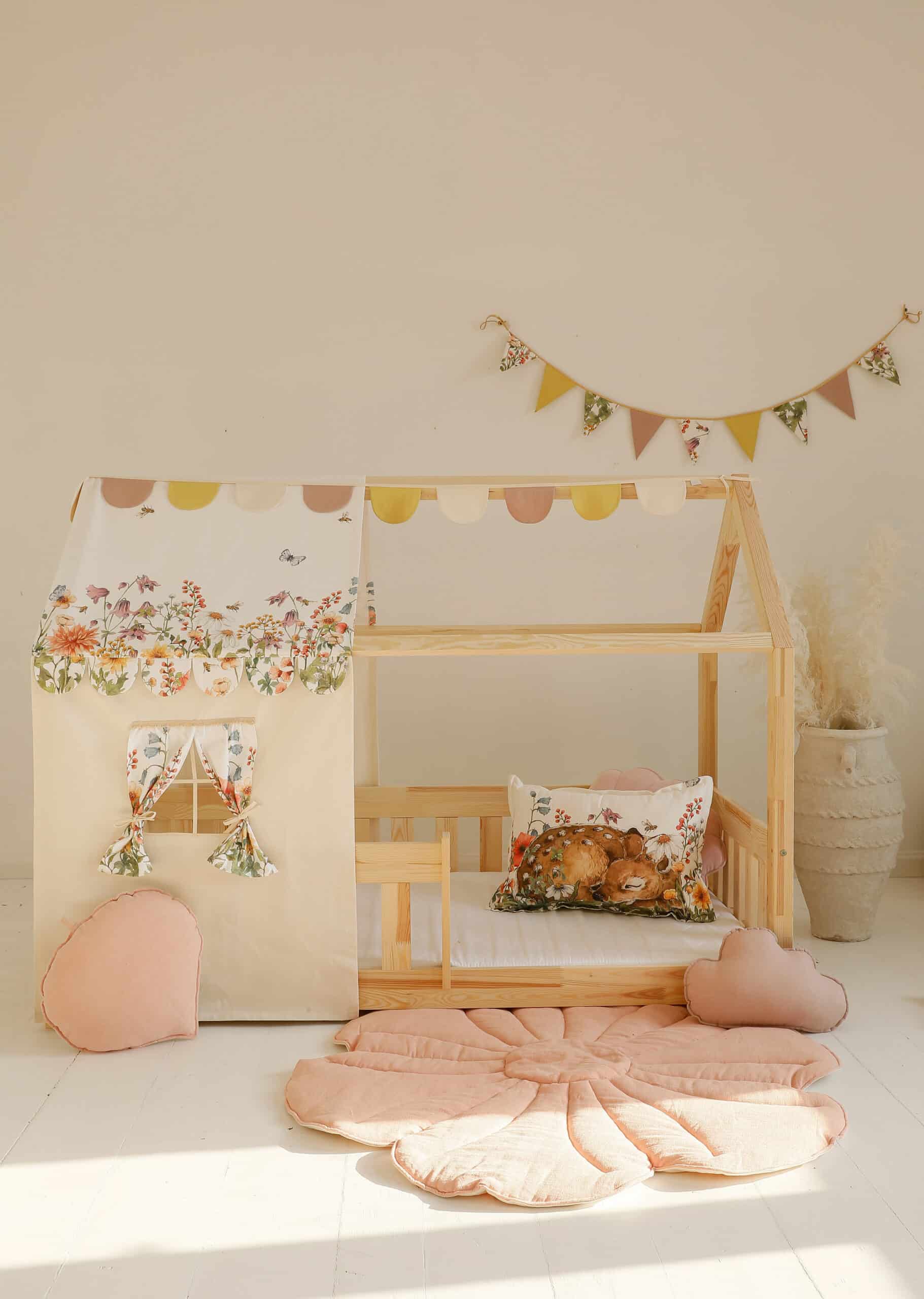 Każdy domek wyposażony jest w daszek, okienka z zasłonkami, kieszonkę na skarby i girlandę pod dachem. To połączenie pięknego wyglądu z praktycznymi rozwiązaniami. Baldachim jest stabilny i łatwy w montażu dzięki troczkom, a całość wykonana jest z tkanin pasujących do reszty naszej kolekcji, co umożliwia tworzenie spójnych aranżacji.