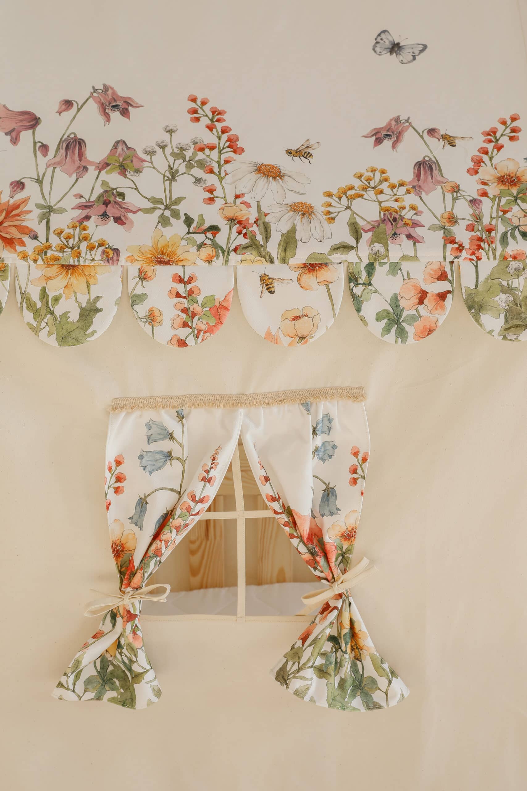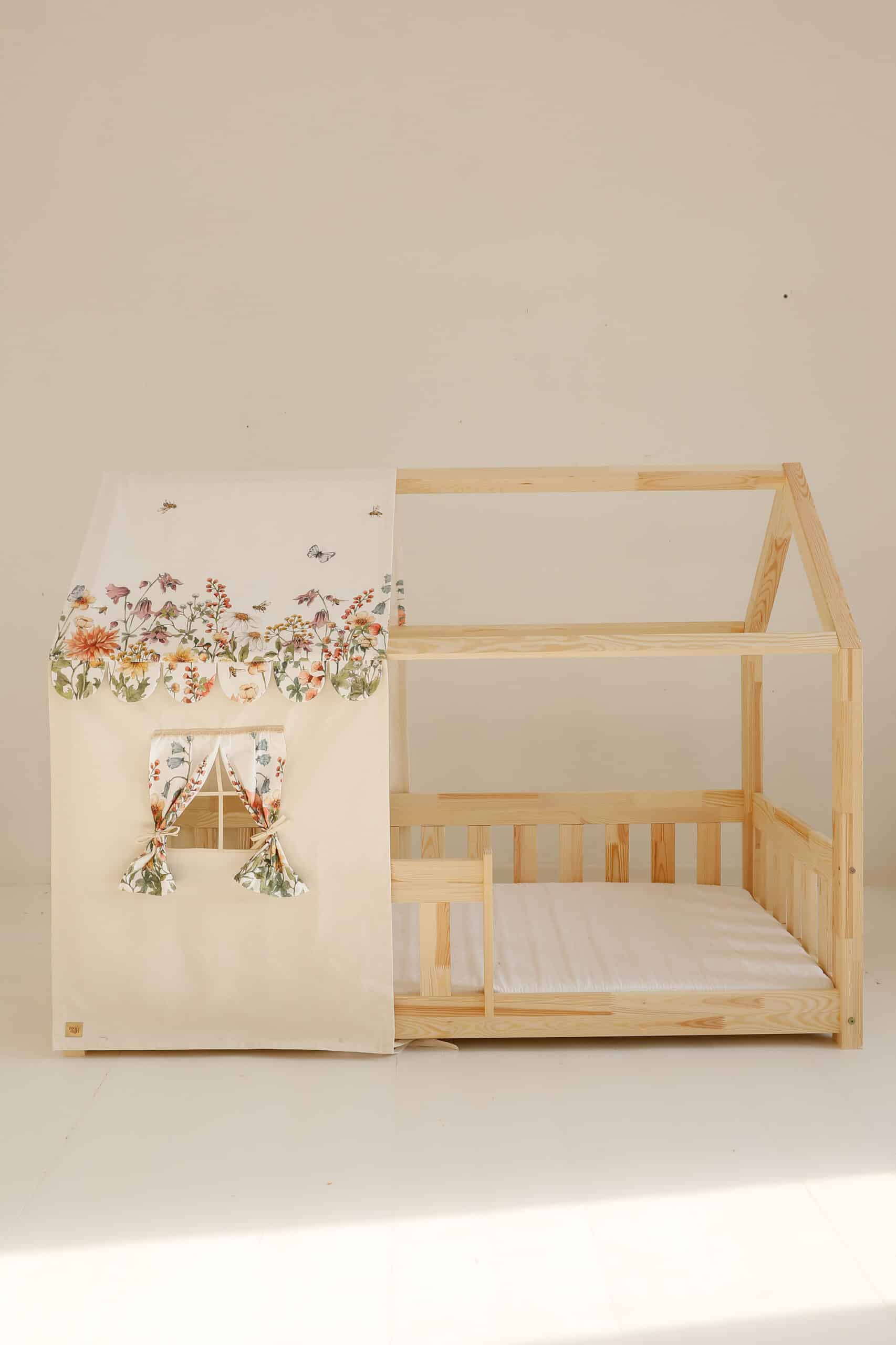 Nasz baldachim w kształcie domku z kolekcji Polne Kwiaty to wyjątkowy element wystroju, który przenosi dziecko do świata pełnego lekkości i kolorów natury. Autorski wzór malowany akwarelą przedstawia polne kwiaty, pszczoły i motylki, tworząc subtelną, bajkową atmosferę w pokoju dziewczynki. To nie tylko dekoracja, ale także przytulne schronienie, w którym maluch może się bawić, odpoczywać i zasypiać w otoczeniu natury.