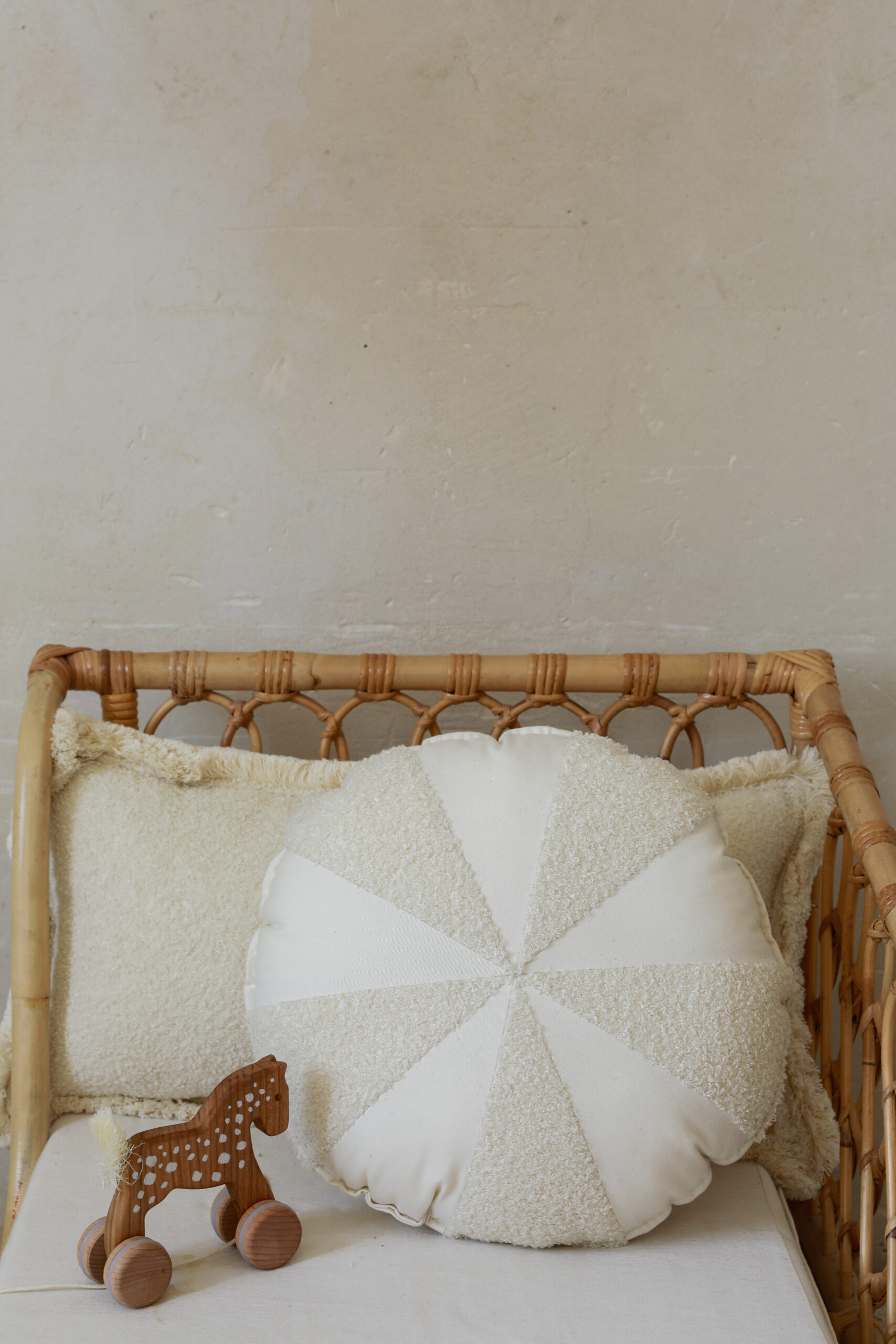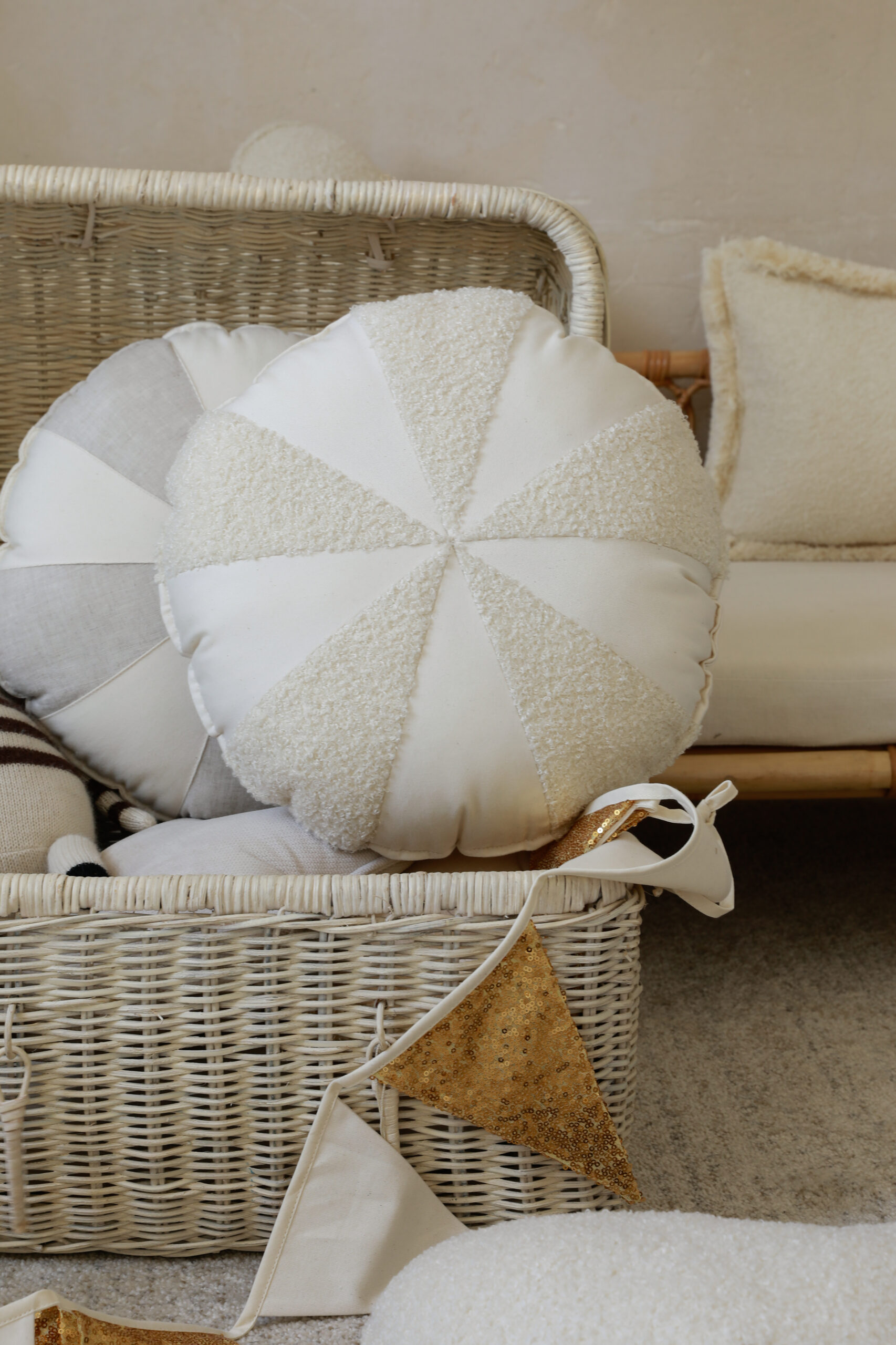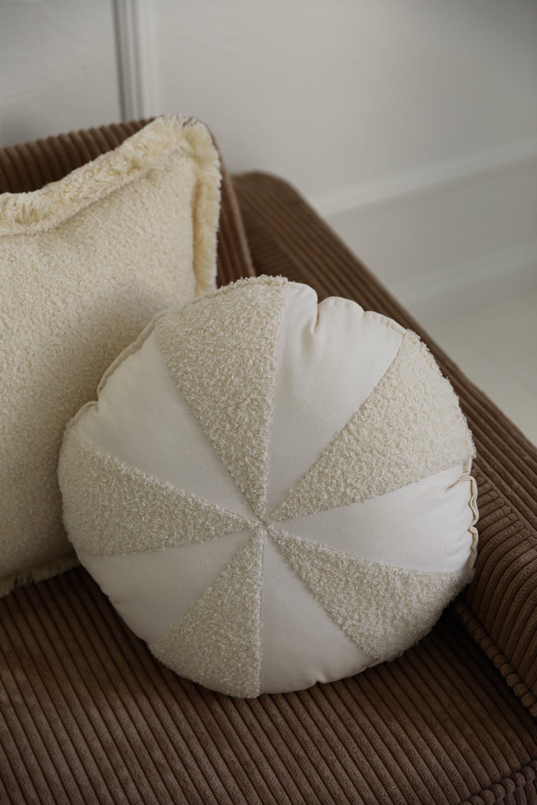 Poduszka patchworkowa boucle cukierek i bawełna “Biały baranek”